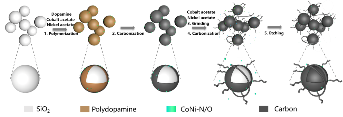 本研究提出了空间利用合理化的思路,为空气电极催化剂的制备提供了新的设计思路和策略,所制备的CoNi负载N掺杂双功能空心碳球/管状碳复合催化剂可作为双功能催化剂用于可充锌空气电池或相关应用。