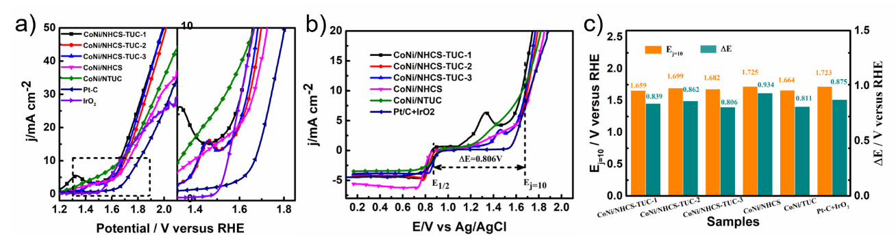 图6 (a) 使用O2饱和的0.1 M KOH 水溶液在5 mV·s-1和1600 rpm 下获得的OER 的RDE 极化曲线;(b) ORR 和OER 的整体极化曲线;(c) 电流密度为10 mA·cm-1时的过电位和Ej="10与半波电位之间的电位差。