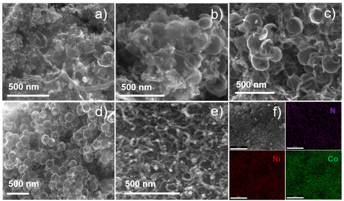 图1样品的SEM图:(a)CoNi/NHCS-TUC-1;(b) CoNi/NHCS-TUC-2;(c) CoNi/NHCS-TUC-3;(d) CoNi/NHCS和(e) CoNi/NTUC。(f)用于EDS 测量的SEM 图及CoNi/NHCS-TUC-3 的N、Ni 和Co元素映射图。