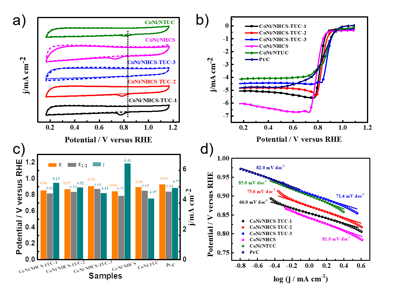 图5 (a) 使用O2或N2饱和的0.1 M KOH 在50 mV·s-1下不旋转获得的循环伏安图;(b) 使用O2饱和的0.1 M KOH 水溶液在5 mV·s-1和1600 rpm 下获得的ORR 的RDE 极化曲线;(c) 使用O2饱和的0.1 M KOH 水溶液在5 mV·s-1和1600 rpm 下获得的起始电位、半斜率电位和极限扩散电流密度。(d) 使用O2饱和的0.1 M KOH 水溶液在5 mV·s-1和1600 rpm 下获得的线性扫描伏安图的塔菲尔图。