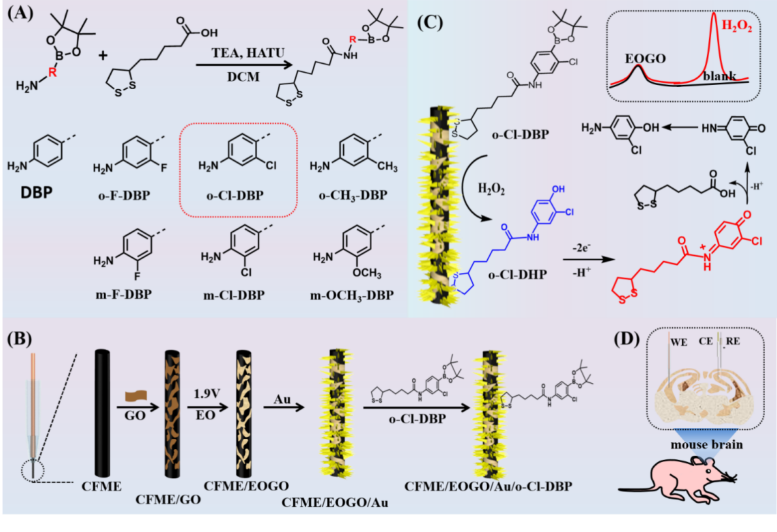 过氧化氢(H2O2)是活体中最丰富、最稳定的活性氧(ROS)之一,作为多巴胺信号的调制器,与帕金森病(PD)密切相关,因此,实现活体脑中H2O2的选择性检测对于研究相关脑疾病的发生与发展至关重要。为此,本研究通过设计一系列DBP衍生物作为电化学探针分子,与H2O2特异性反应,根据反应产物DHP衍生物的电化学信号对H2O2实现高选择性检测。在所设计的系列DBP衍生物电化学探针分子中,o-Cl-DBP与H2O2反应时间最短,反应产物o-Cl-DHP表现出更高的电流密度且更负的氧化电位,这说明其对H2O2检测的性能最佳。此外,在碳纤维丝微电极(CFME)上修饰了电化学氧化石墨烯(EOGO)作为基底材料,不仅可使H2O2检测的灵敏度显著提高,而且可提供稳定的内参比信号,避免环境因素的干扰。以此构建的H2O2比率型电化学微传感器具有灵敏度高、选择性好、重现性好等优势。最终,该电化学微传感器成功地应用于PD小鼠脑中不同亚区H2O2的监测。同时,该工作表明,与正常小鼠相比,PD小鼠中不同脑区的H2O2和抗坏血酸(AA)表现出动态变化,表明H2O2和AA的平衡可能PD的发生与发展中发挥着重要的作用。
