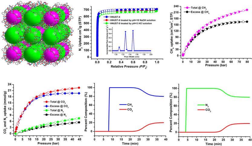 Fig. 1 Crystal structure, gas storage and separation of HNUST-8 at 298 K.