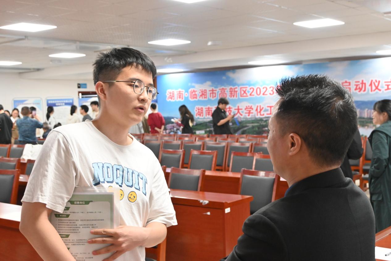 临湘市高新区化工园企业湖南福尔程环保科技有限公司代表李永战、湖南维摩新材料有限公司董事长胡晓珊分别就其产业目前发展前景发言,希望同学们能够踊跃参与招聘。