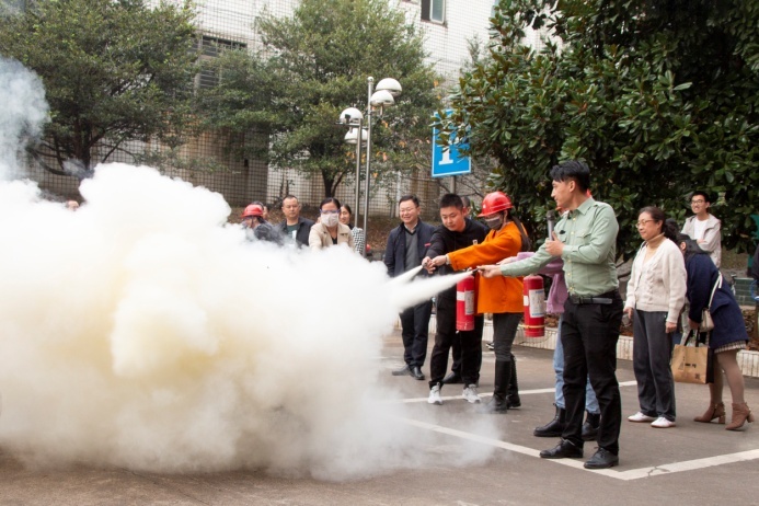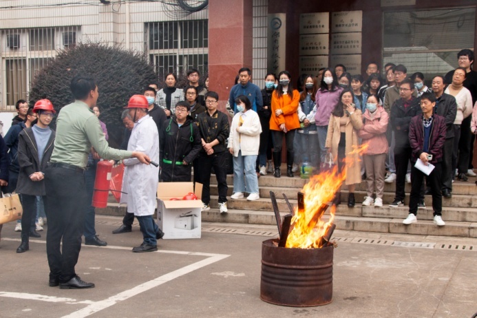 随后,火灾事故应急处理演练在化学楼前坪进行。杨东升讲解了示范灭火器使用“五字诀”要领,即“摇、拔、握、压、喷”。参与演习的师生佩戴头盔与护目镜,按次序拿起灭火器,摇晃瓶身使干粉不再沉淀,拔出保险环,手握管子前端金属环微微下压,喷出干粉熄灭铁桶中燃起的熊熊火焰。