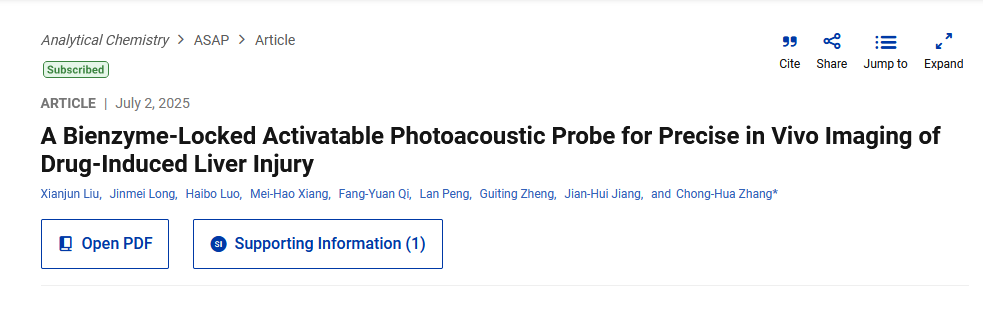 近日,公司教师刘贤军副研究员,张崇华副教授开发了一种新型双酶型可激活式光声探针用于药物性肝损伤的精准活体成像。该研究成果以“A Bienzyme-Locked Activatable Photoacoustic Probe for Precise In Vivo Imaging of Drug-Induced Liver Injury”为题发表在国际顶级期刊《Analytical Chemistry》上,该期刊为分析化学领域的经典Top期刊。该研究工作主要由刘贤军博士(第一作者)和张崇华副教授(通讯作者)共同完成,英国be365官网为第一单位。