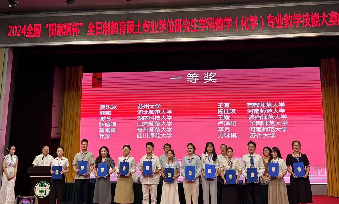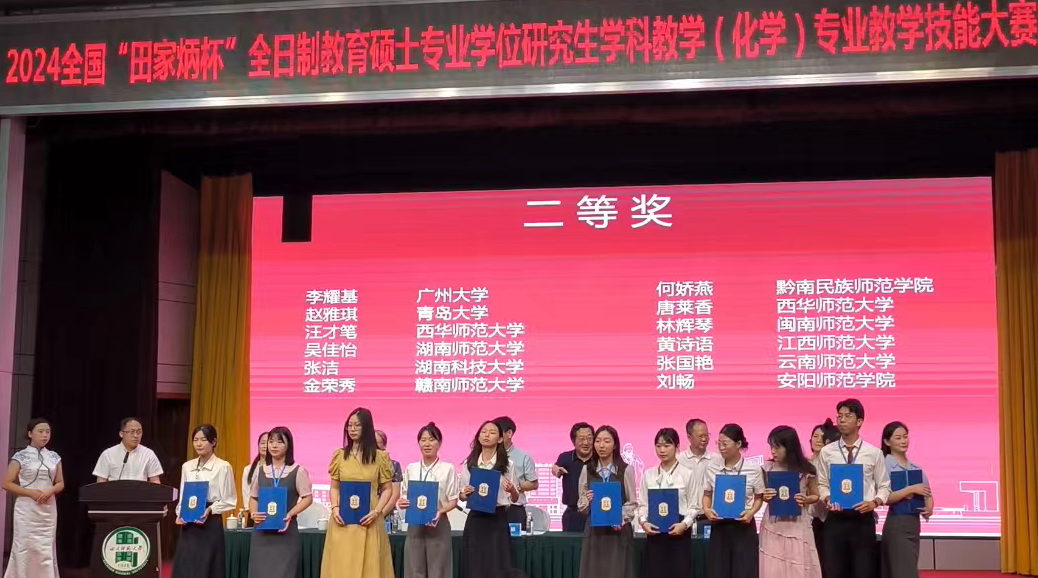 2024年9月8日,2024年全国“田家炳杯“全日制教育硕士学科教学(化学)专业学位研究生教学技能大赛在四川师范大学顺利落幕,英国be365官网本次入围决赛的两名选手全部获奖。其中,2022级谢锐同学大赛一等奖、2023级张洁同学获得大赛二等奖。这是公司研究生参加该赛事以来的最高获奖也是获奖人数最多的一次。