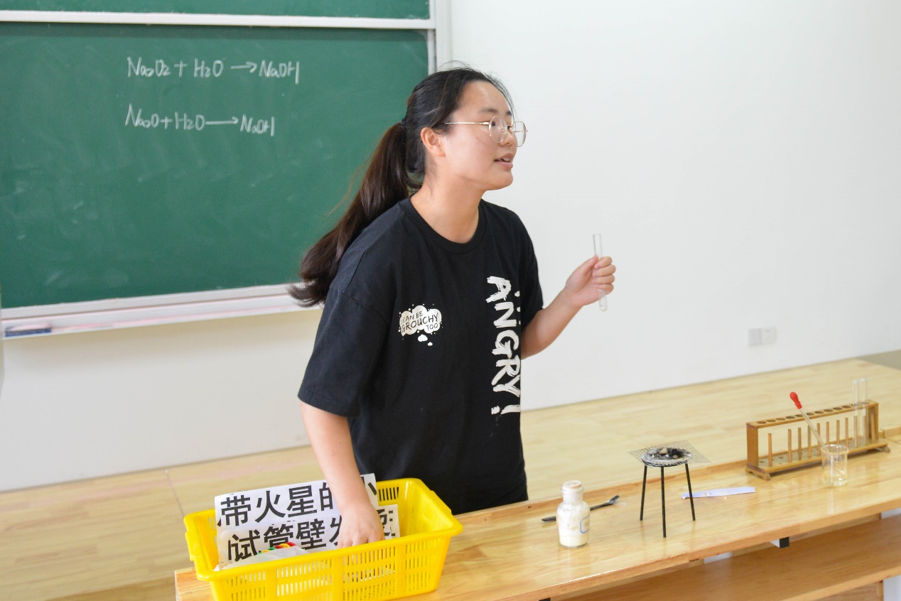 比赛过程中,选手们以板书展示教学内容,通过实验加强课堂互动,用准确精炼的语言向大家展示自己的教学亮点。他们以自己独特的见解,对化学概念、化学物质等内容进行不一样的剖析,将零散的化学知识点以有趣的方式进行串讲。