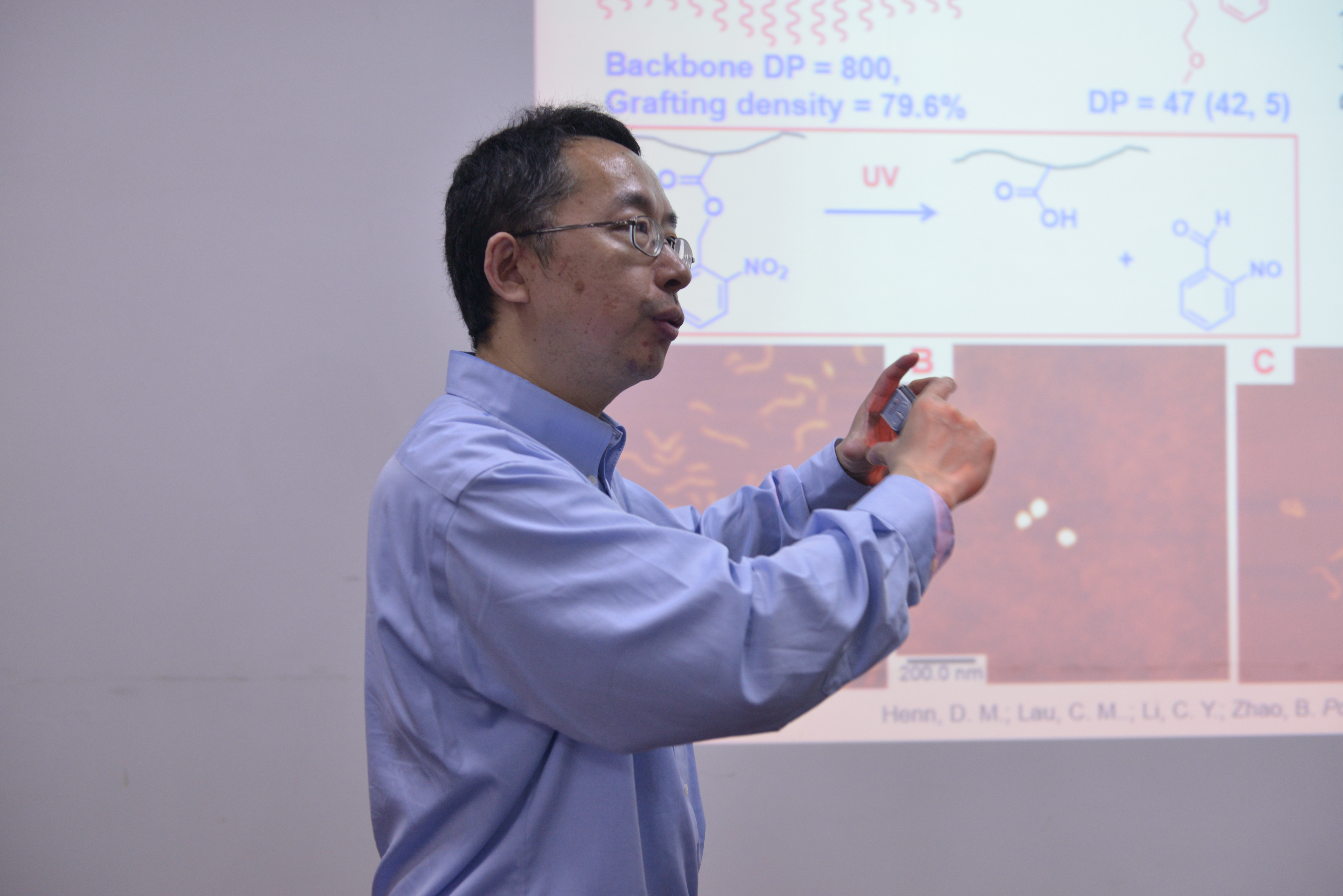 5月6日下午4点,应公司和理论有机化学与功能分子教育部重点实验室邀请,美国田纳西大学赵斌教授在化工楼310学术报告厅,以“Macromolecular Brush Materials(高分子刷材料)”为主题作了一场精彩的学术报告。报告会由理论有机化学与功能分子教育部重点实验室主任唐子龙教授主持,英国be365官网、理论有机化学与功能分子教育部重点实验室师生80余人到场聆听。