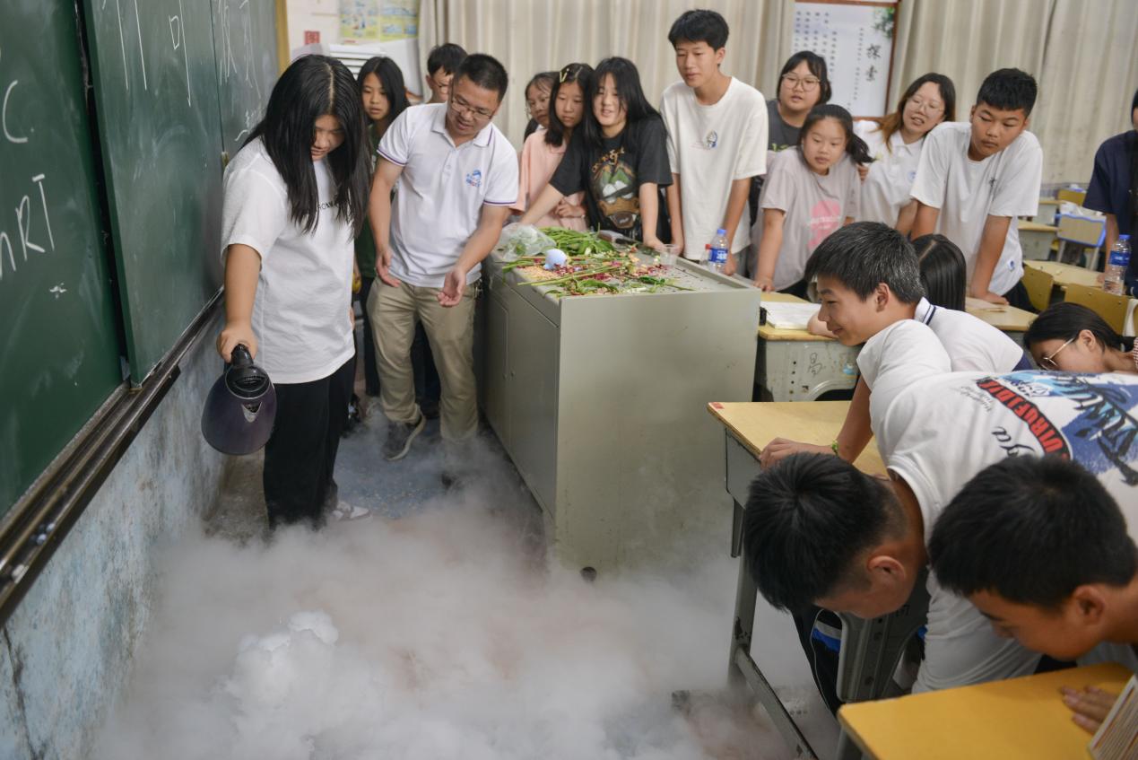 紧接着,曹佳民博士拿起一个装满水的气球放入液氮中,过了一会儿再拿出来时,原本软趴趴的水球已变成一个散发着“冷气”的冰球,同学们相互传递冰球,纷纷感叹液氮的神奇制冷能力。随后,曹佳民邀请一位同学往装着液氮的保温桶里加入开水,滚烫的水接触到液氮的瞬间有大量白雾从保温桶中冒出。白雾飘在脚下,同学们如临仙境,整个教室如梦似幻。